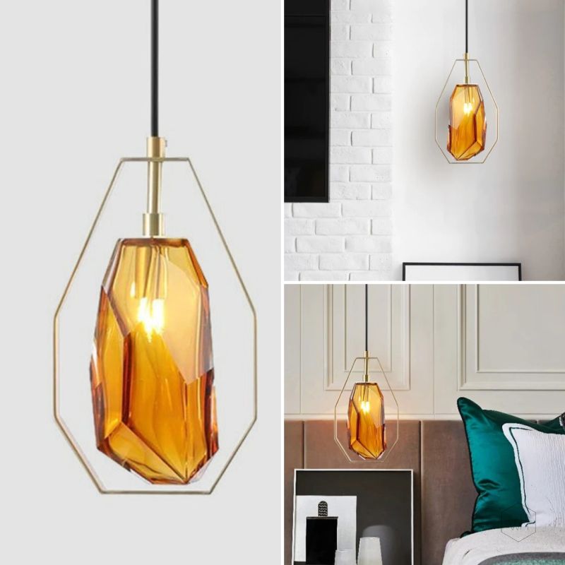 Enhance your space with the sleek Modern Crystal Rock Style Glass Pendant Lamp, featuring a stunning amber glass shade and geometric metal frame, perfect for adding elegance to any room.