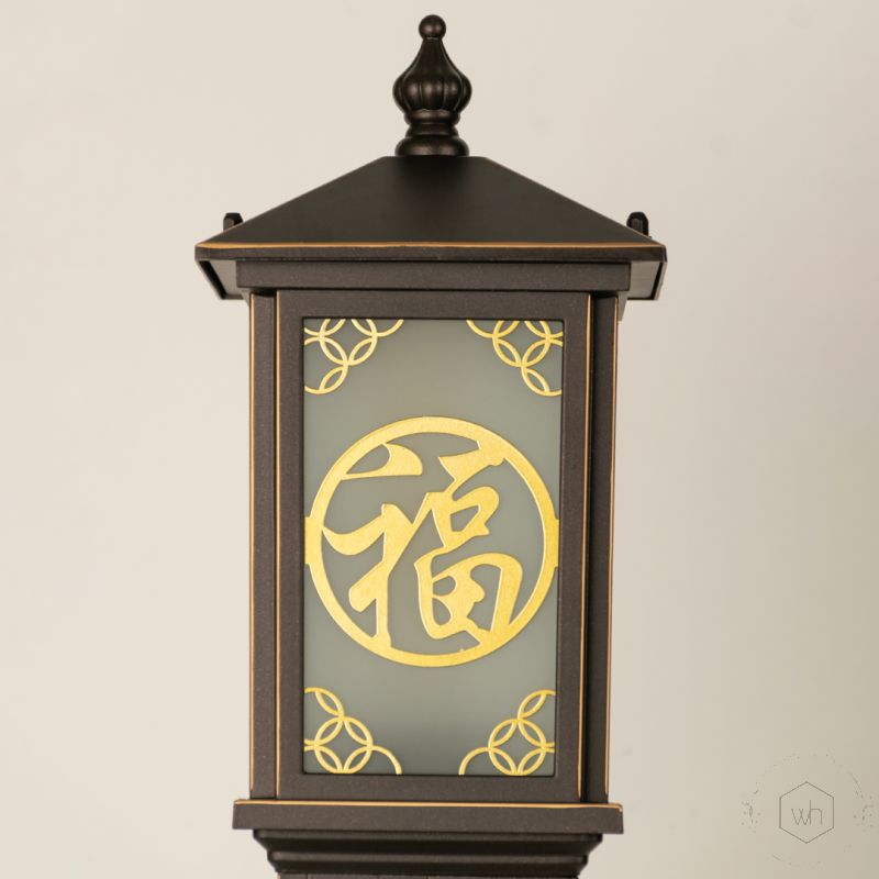 The video highlights the lantern’s ornate gold detailing and the prominent Chinese “福” (fu) symbol through smooth on/off transitions and zoom-in and zoom-out views. The frosted panel emits a soft, warm glow, blending traditional symbolism with refined outdoor ambiance.