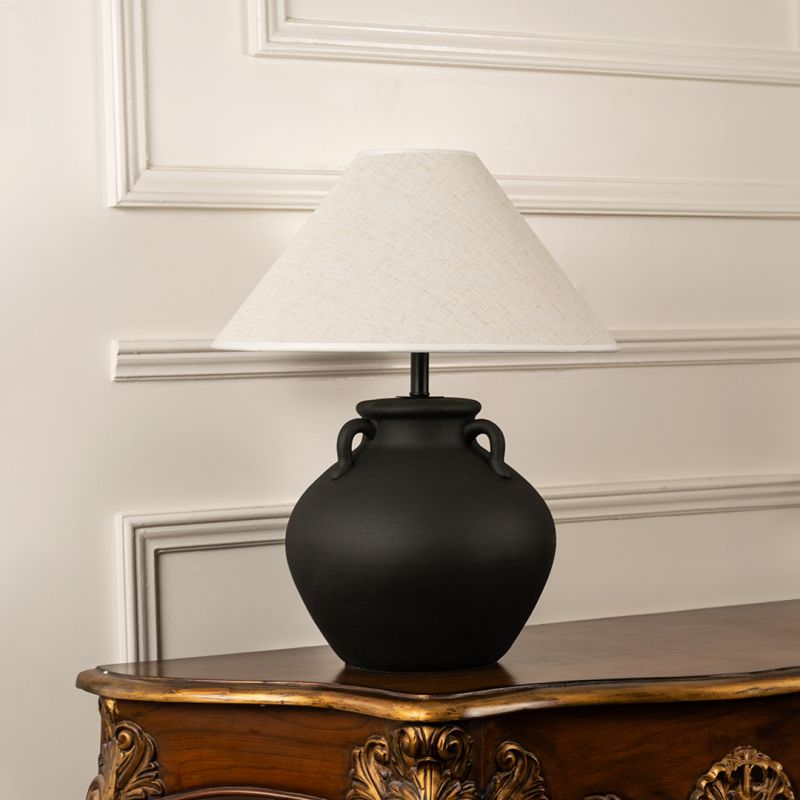 The Radin Table Lamp brings vintage charm and elegance to any room with its unique ceramic pot-like structure. The matte black finish of the base gives it a sophisticated, rustic look, while the white fabric lampshade adds a soft contrast, creating a beautiful balance of style and function. Perfect for enhancing living rooms, bedrooms, or hallways, this lamp is sure to be a standout piece in your home decor.