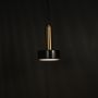 Black marble and metal round base pendant light shown in close up view with light off for modern luxury décor.