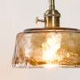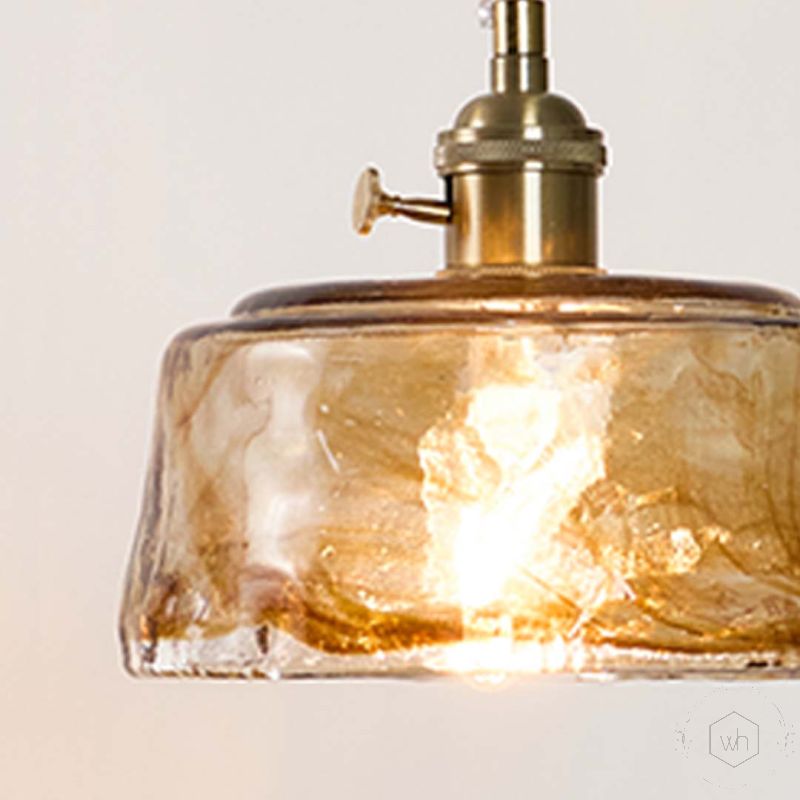 Closeup of amber glass pendant lamp showing textured bubble glass shade and brass hardware detail with vintage Edison bulb.