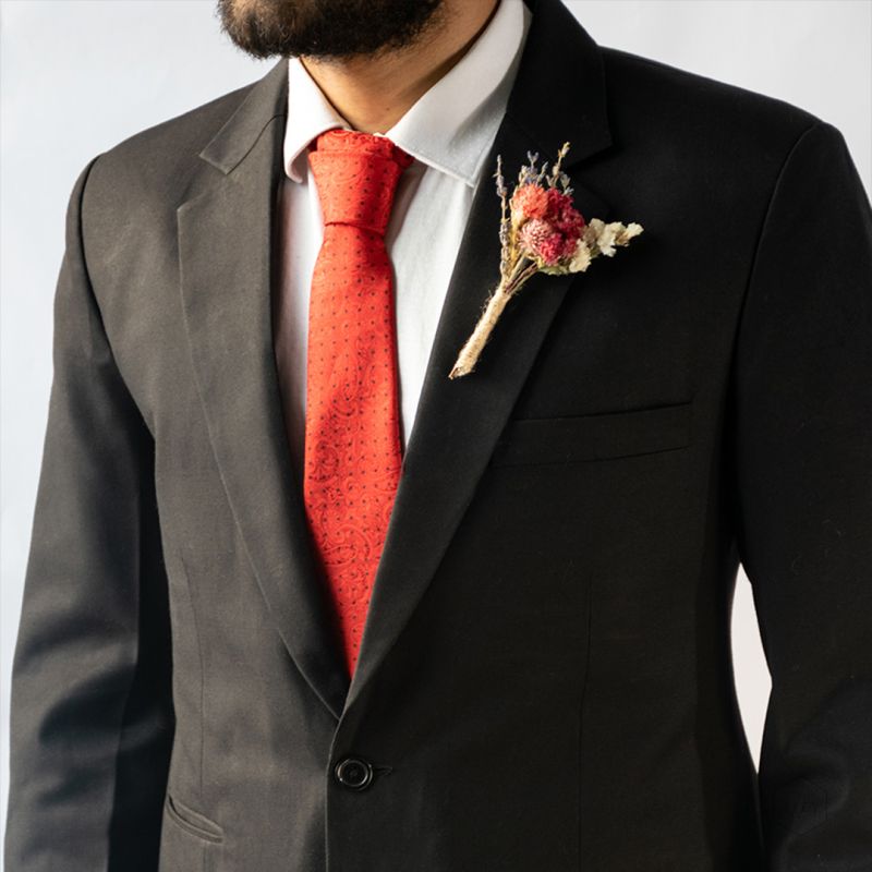 A colorful boutonniere to uplift your look for a special wedding or ceremony. Featuring dried botanicals of top-notch quality tied together in a long-lasting arrangement. Purple lavenders, white flowers, pink small daisies, and colorful strawberry dried botanical make it a stunning item to accessorize your outfit for a function. Adorn on lapel's of your coat or jacket to complete the look. You can also use it for gifting purposes.