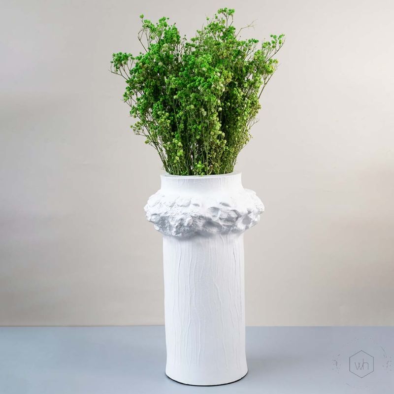 Cream sola flower sticks in a ribbed ceramic vase with artificial decorative flowers for modern home and office decor.