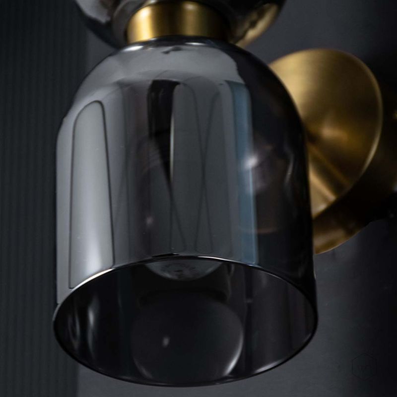 Smoked glass and gold metal wall light with bulbs off on a white background highlighting its double cylinder shades and sleek contemporary structure.