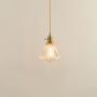 Industrial pendant light with ribbed glass shade and antique brass finish shown in lifestyle and closeup views.