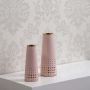 Pink ceramic vase with gold detailing placed on a white shelf against a patterned wall adding a soft modern touch to living room decor.