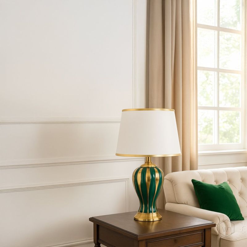 Table lamp with green and gold ceramic base and white shade displayed on a clean white background for clear product view.
