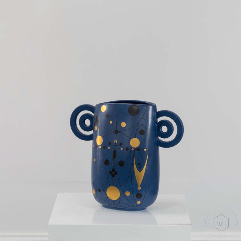 Enhance your home decor with the Barrit ceramic vase, featuring a majestic blue shade and glossy designer patterns on its pitcher silhouette.