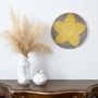 Round wicker wall plate handmade with yellow navy and beige woven star pattern ideal for boho wall decoration.