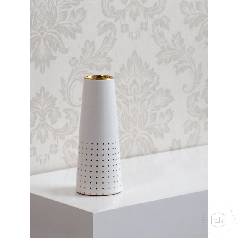 The Beca Vase features an elongated cylindrical design in white with elegant gold accents. Perfect as a solo statement or layered on work desks, it enhances any formal space effortlessly.