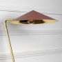 Orange cone wall light with brass fixture glowing on white wall adding warm color and elegance to modern interior decor.
