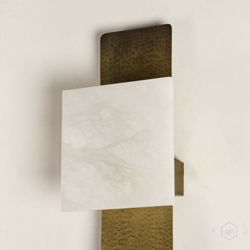 Closeup of marble wall lamp showing textured brass panel and polished marble block crafted with precision for premium interior design.