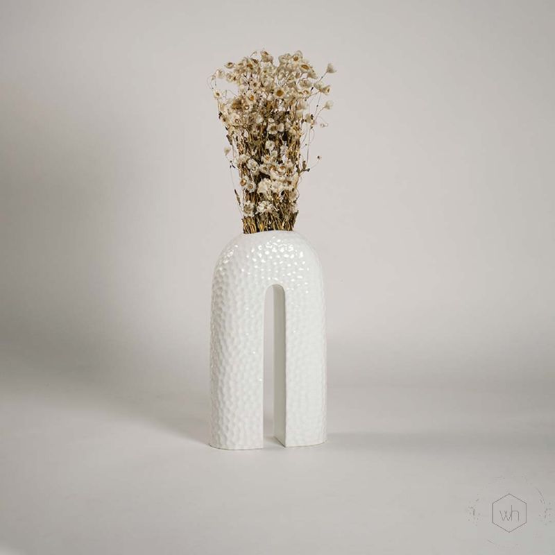 Enhance your decor with this uniquely designed ceramic vase, featuring a grainy texture and an inverted U-shape silhouette. Its classic white tone and earthy colors make it a perfect choice for adding a modern touch to your space.