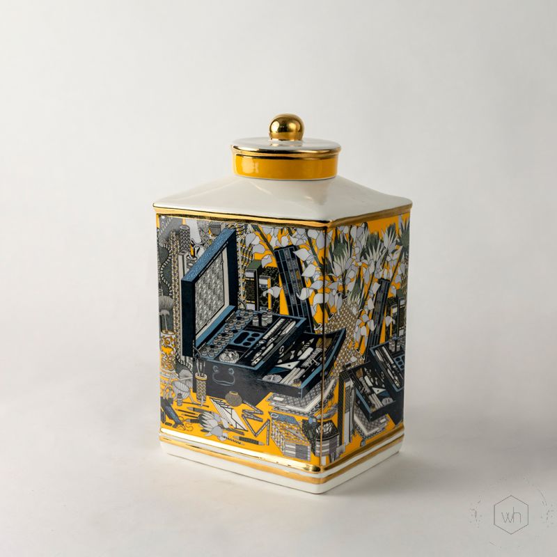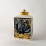 The jar has a smooth, glazed finish with detailed printed artwork. It does not have a raised texture but maintains a luxurious, refined feel.