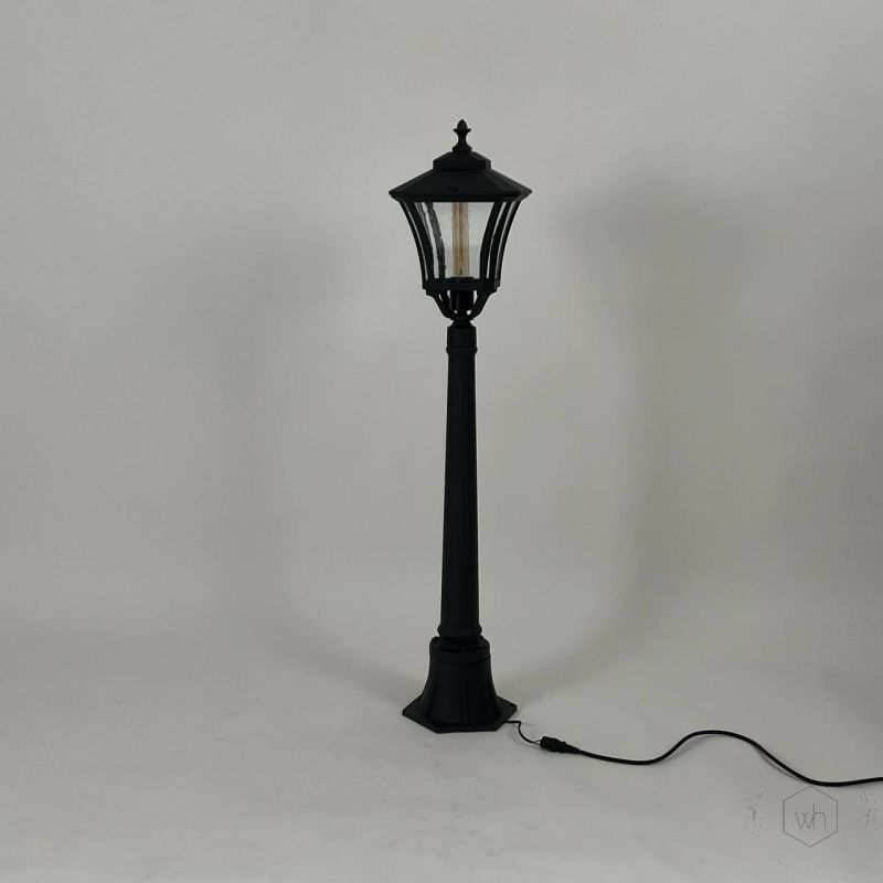 The Chamber Outdoor Pole Light in black is a perfect addition to enhance the ambiance and functionality of outdoor spaces. Designed with a timeless lantern-style top and a sturdy pole, this fixture is ideal for illuminating driveways, gardens, pathways, and entrance areas. Crafted from high-quality metal with a weather-resistant finish, it ensures durability and long-lasting performance in all weather conditions. The clear glass panels provide ample brightness while adding a touch of sophistication to your exteriors.
