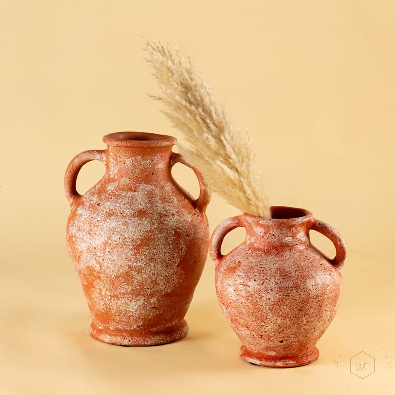 A stunning medium Terracotta Vase featuring an off-white crackled effect detailing across the whole vase, giving it a textured look and feel.