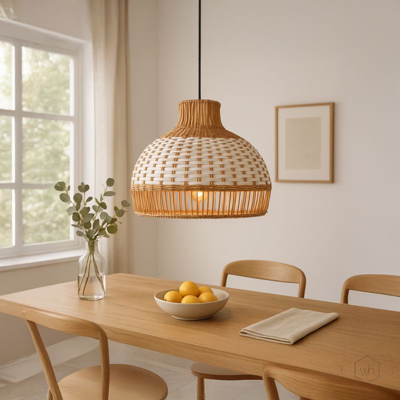 Yes, the combination slightly softens the light, with the white weave brightening the glow and the natural rattan adding a warm undertone.