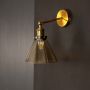 This product video showcases a timeless wall sconce featuring a flared smoky glass shade and a warm brass fixture. The video includes lighting transitions and detailed close-ups to emphasize the textural richness and vintage charm of the piece.