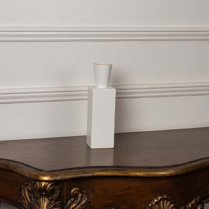 Serene white shade and quirky edgy silhouette, David Vase is grand in both size and style. The clean-edged cuboidal silhouette with a conical neck and little round mouth makes it a charming pick for your living room, bedroom, or hallway console's contemporary theme decor.