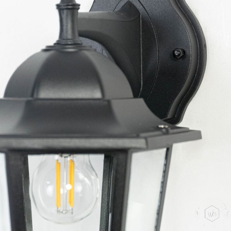 The Down Facing Outdoor Wall Light - Small offers a timeless design with a classic black finish and clear seedy glass, perfect for adding charm to your outdoor or indoor spaces.