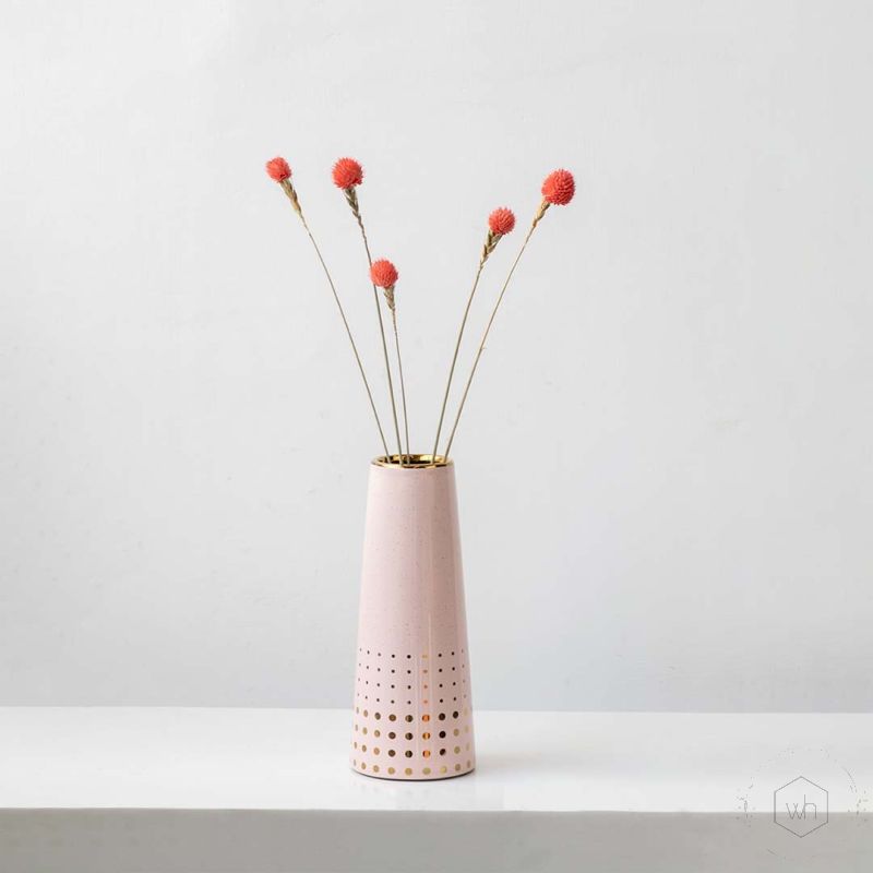 - Cylindrical pink vase with metallic gold details and cutouts