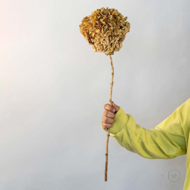 Elevate your home’s organic charm with this rich golden dried hydrangea. Its full-bodied bloom and warm tone make it a striking accent, perfect for standalone display or part of an elegant arrangement.