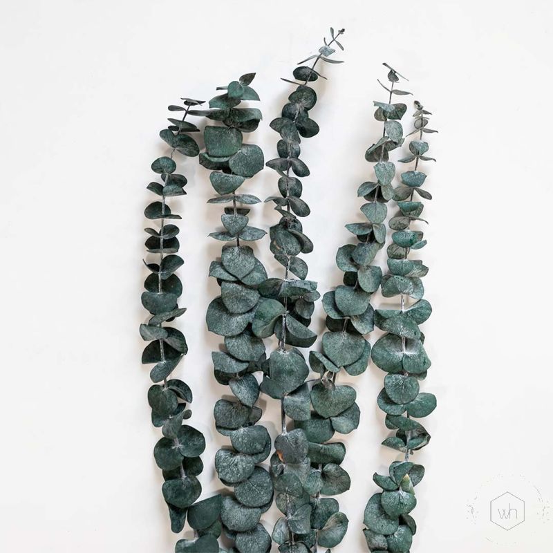 Single dark green dried eucalyptus stem displayed on a clean white background ideal for modern natural home styling.