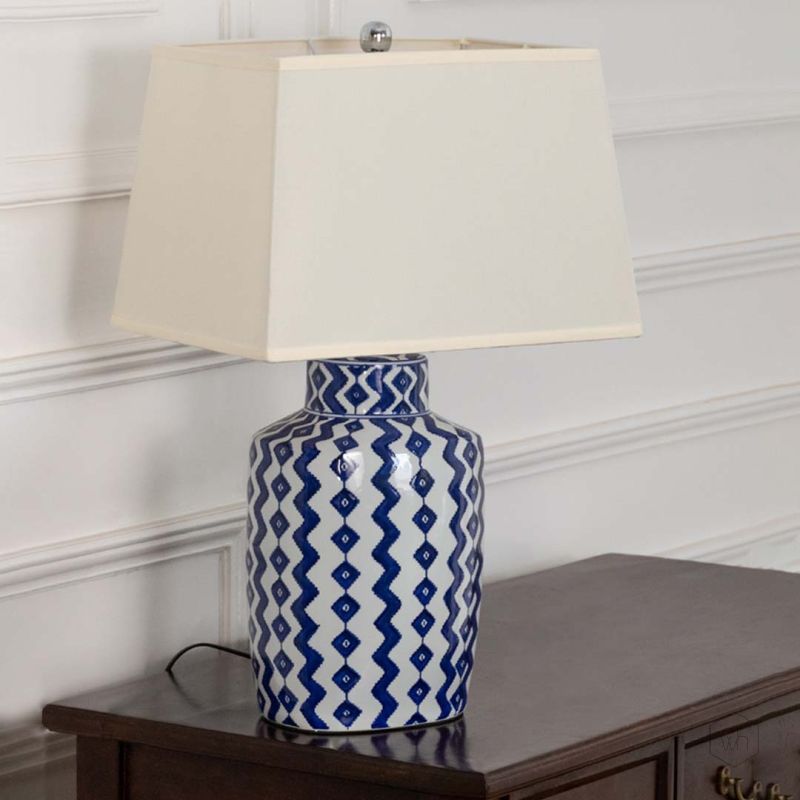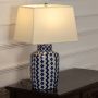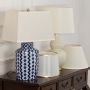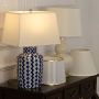 Beige shade blue patterned lamp on console table with light on and cream wall background for soft decorative décor.