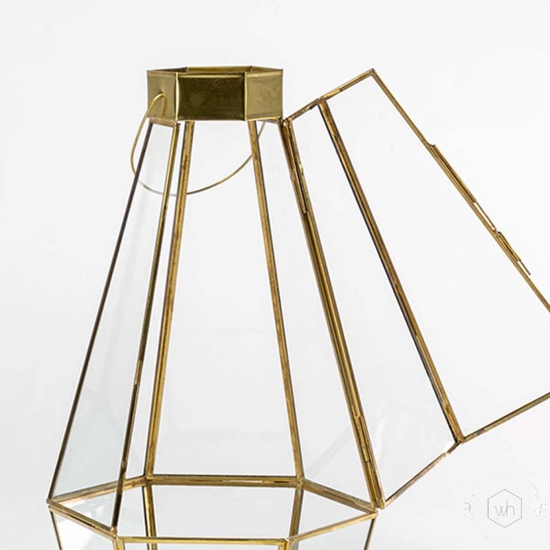Materials: Sturdy Metal frame with intricate faceted designs and Glass panels.