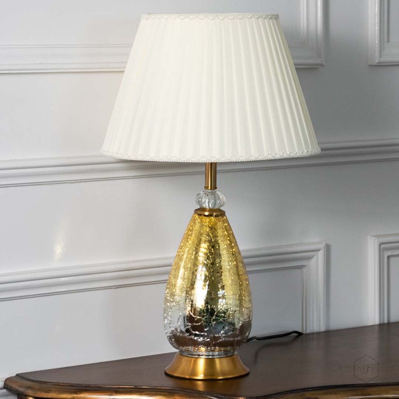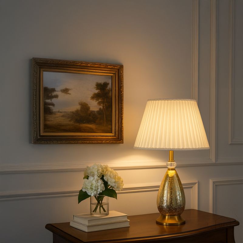 This lamp features a premium glass base adding a luxurious touch. The lampshade made from high-quality fabric that complements the design and provides soft, diffused lighting.