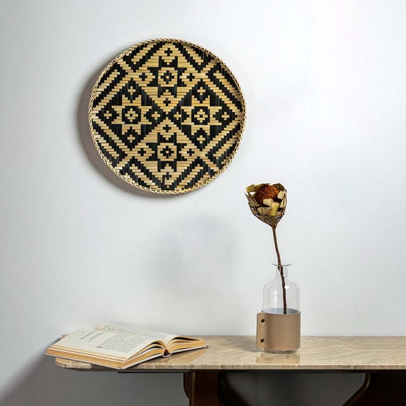The pattern is formed by interweaving dyed and natural bamboo strips, not by painting or printing, which keeps the look clean and long-lasting.