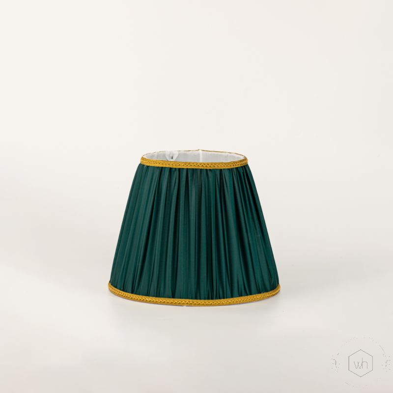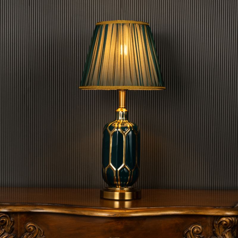 Add a touch of vintage opulence with this emerald green and gold table lamp, featuring an art deco-inspired ceramic base and a pleated fabric shade trimmed in gold. This lamp is perfect for adding bold character to traditional or maximalist spaces. The video emphasizes the glossy textures and golden highlights under ambient lighting.