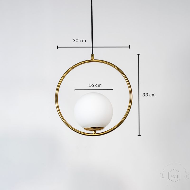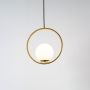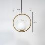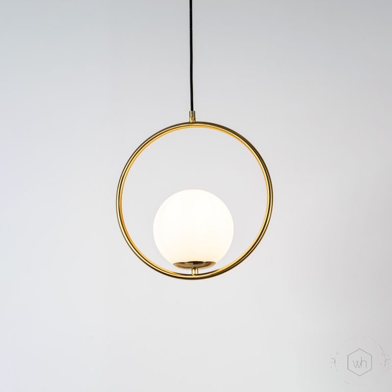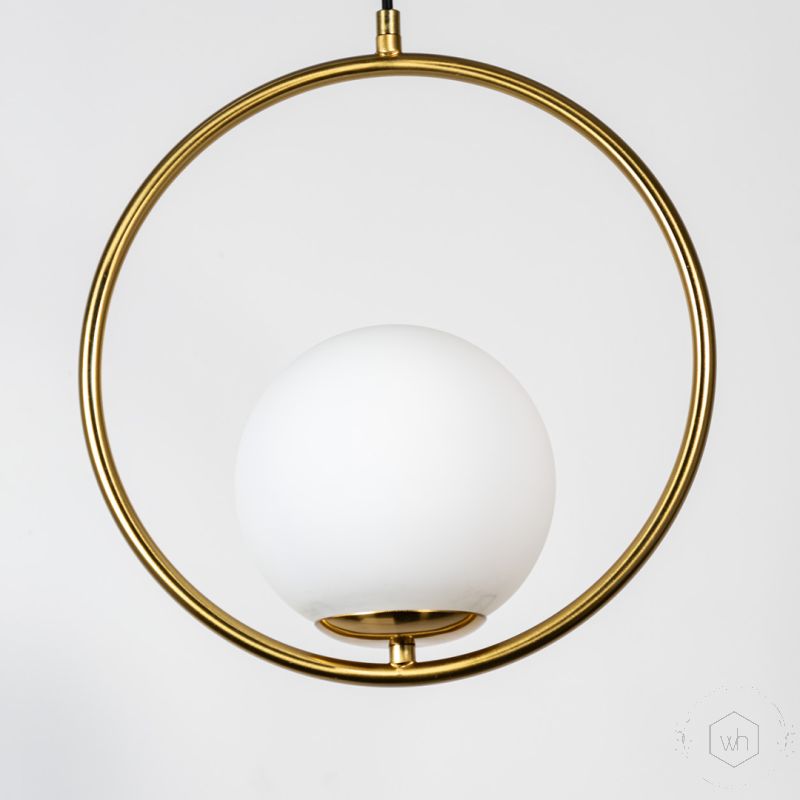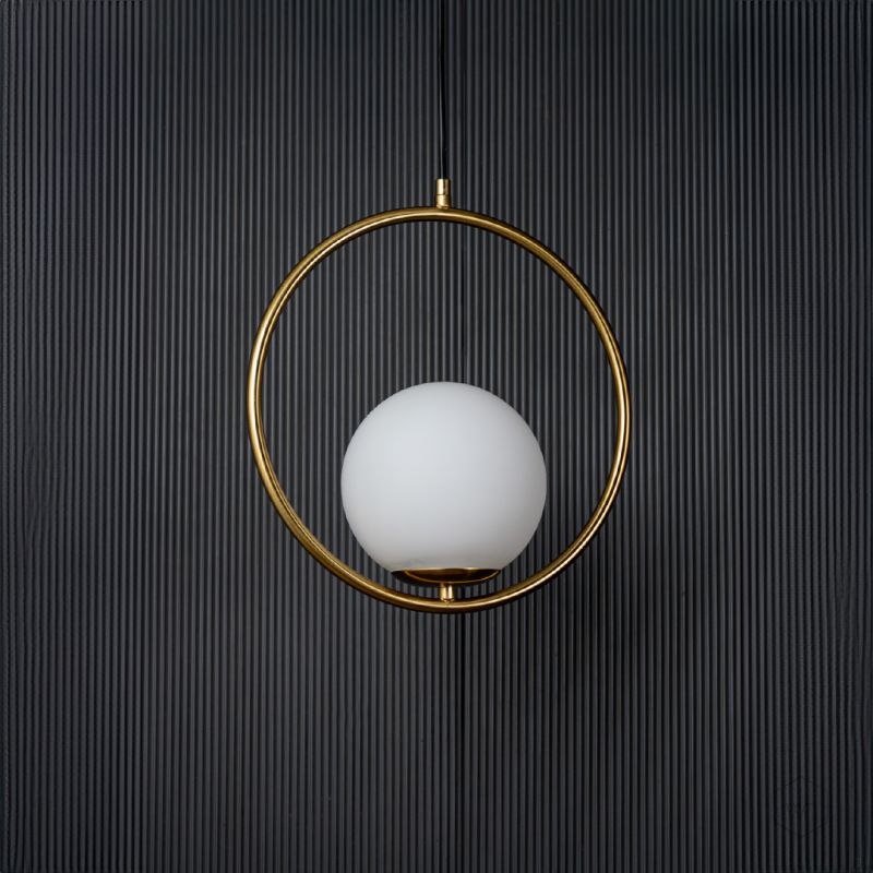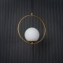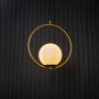 A closeup view of the circular pendant lamp showing the smooth white globe and golden ring frame with detailed texture and refined modern craftsmanship.