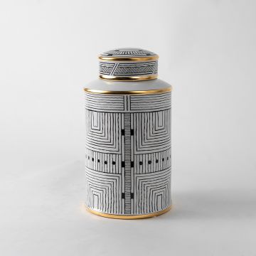 Classic cylindrical silhouette with soft edges and a serene blend of white and golden tones, the Ceramic Fulgar jar is a perfect pick for your living space, exhibiting artistic and minimalist vibes. Here are the key details: