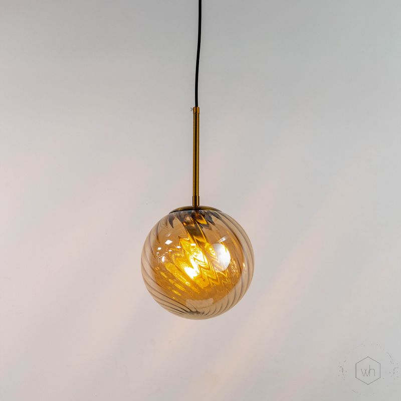 Elevate your interiors with the Glimmer Glow Gold Glass Hanging Pendant Lamp, featuring a sophisticated globe-shaped glass shade with intricate spiral textures. Its warm glow and golden accents bring elegance and charm to modern and transitional spaces.