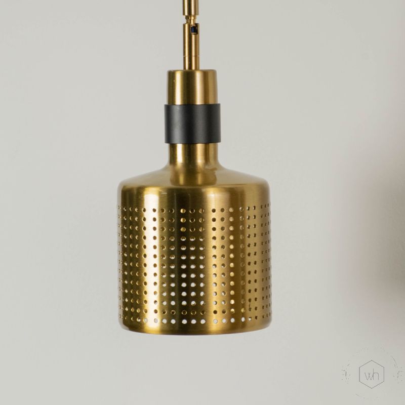 - Brushed brass cylindrical shade with fine perforations