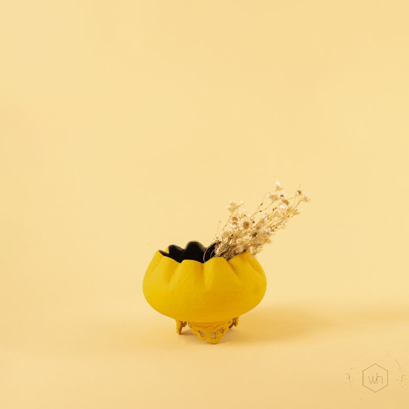 Yellow metal scalloped bowl planters displayed together creating a vibrant modern decor look ideal for centre tables and shelves.