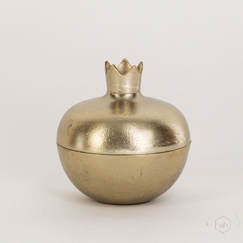 The Harumi Pomegranate Box - Large is a stunning fusion of functionality and symbolism, crafted from premium aluminium with a radiant gold finish. Designed in the shape of a pomegranate, this decorative box opens to reveal hidden storage—perfect for trinkets, keepsakes, or festive treats.