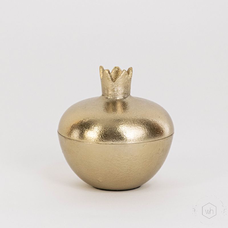 The Harumi Pomegranate Box - Medium offers a perfect blend of decorative charm and practical storage. Made from aluminium with a luxurious gold finish, this mid-sized box features a symbolic pomegranate shape with a removable lid—ideal for storing small trinkets, jewelry, or festive treats with style.