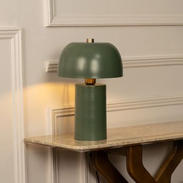 Table lamp with green metal base and pleated white shade styled on a wooden console for elegant warm home decor.