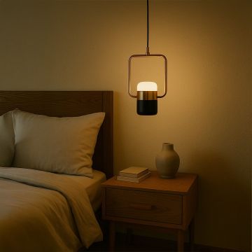 A warm bedroom scene featuring a modern pendant light glowing softly above a cushioned bed with neutral decor creating a serene and elegant ambiance.