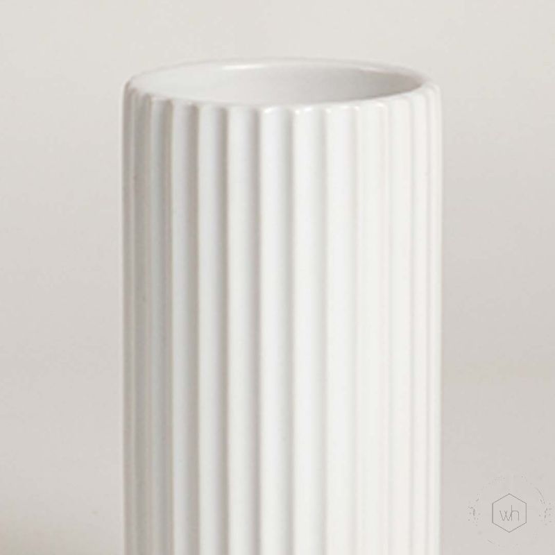 Inoa Vase - Small features a classic cylindrical design with symmetrical straight lines and a serene white finish. Perfect for adding minimalistic charm, it complements blossoms or succulents to enhance any living space.