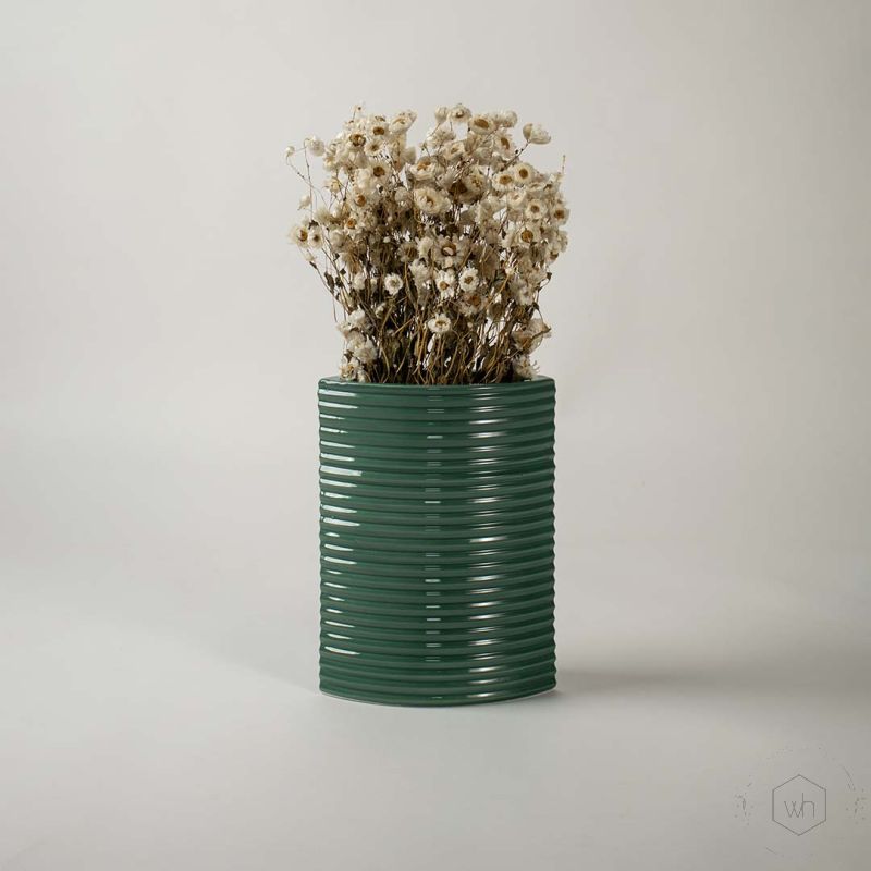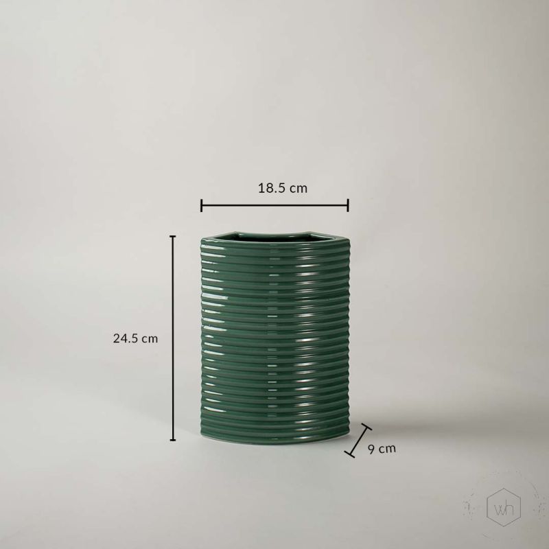 Unique in style and built, the Juna Ceramic Vase is an absolute stunner and an eye-catcher. The glossy ceramic matte finish radiates a soothing and refreshing green color. Its sleek body is embossed with horizontal line patterns, creating a beautifully symmetrical aesthetic.