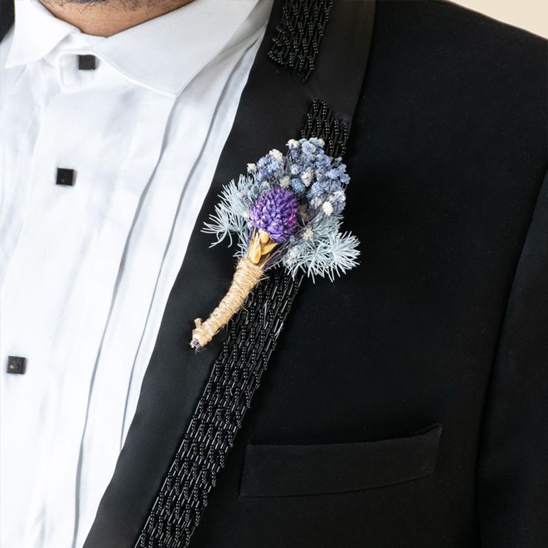Ideal for gifting on special occasions, this blush pink mix of dried flowers looks stunning on any formal suit and is a great addition to groom and groomsmen outfits. The light purple dried grass adds a memorable touch to your special day.