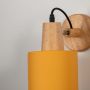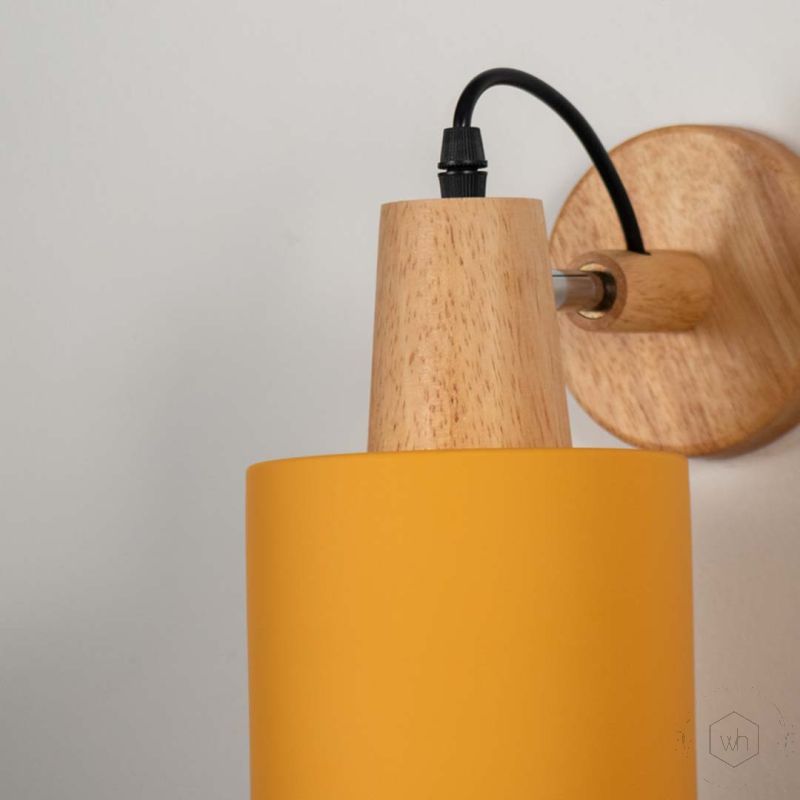 - Matte yellow cylindrical shade with a natural wooden bracket