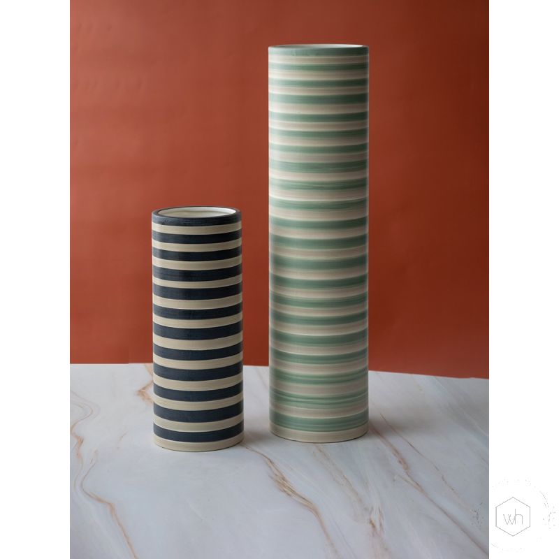 Introducing the Masih Ceramic Vase, featuring a classic cylindrical silhouette with a sophisticated blend of glossy black hues. The symmetrical black stripes on its tall, slender body enhance its chic ceramic finish, making it a stylish addition to any interior.