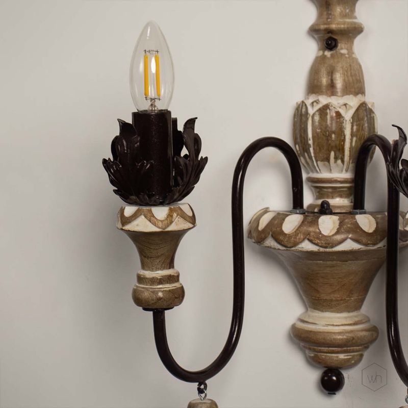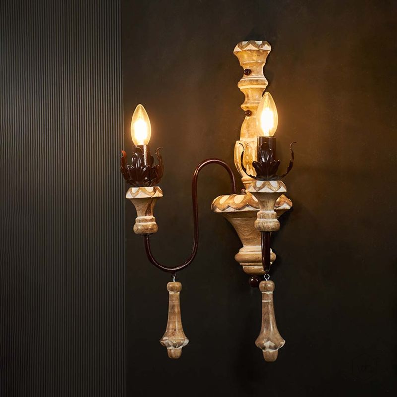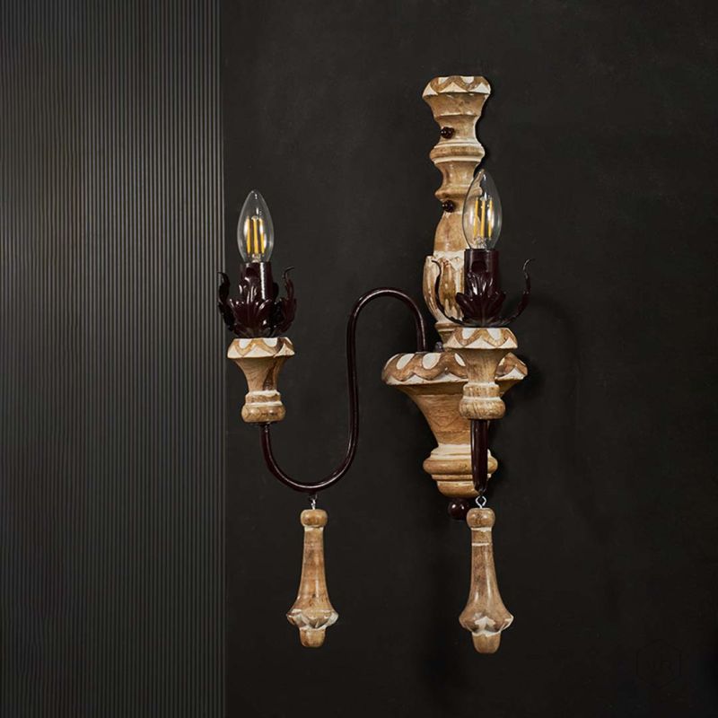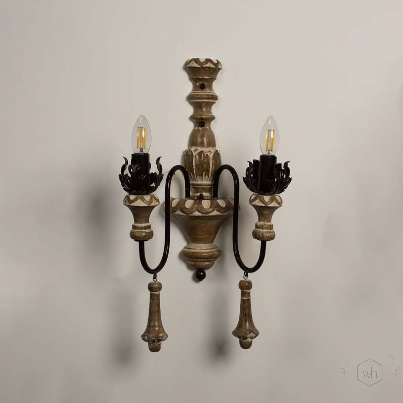 Design: Mid-century 2-light wooden wall lamp with a distressed grey finish.