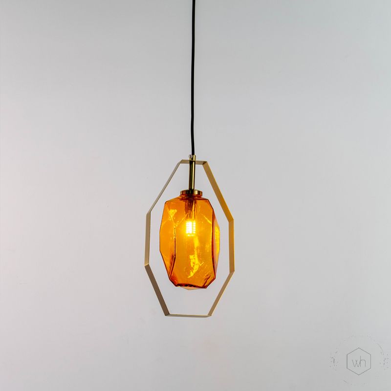 Enhance your space with the sleek Modern Crystal Rock Style Glass Pendant Lamp, featuring a stunning amber glass shade and geometric metal frame, perfect for adding elegance to any room.