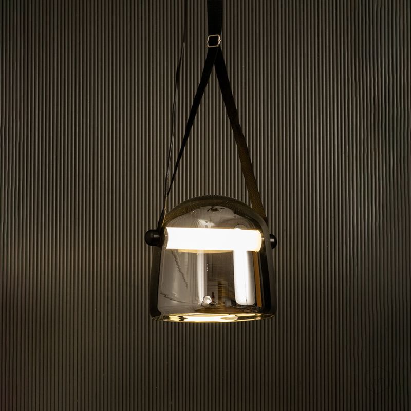 The strap is a key functional element in this design, allowing the fixture to be suspended in a unique and adjustable way, adding visual interest and versatility.