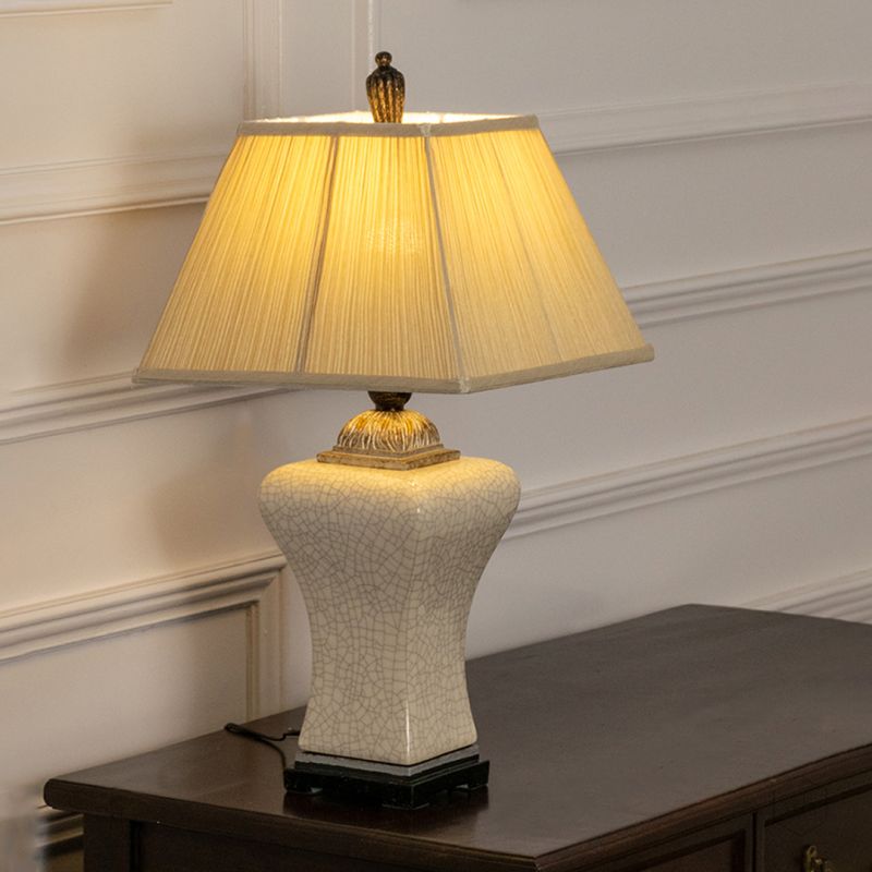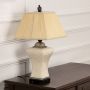 Pleated shade white ceramic table lamp on wooden sideboard with light on beside décor pieces for warm traditional décor.